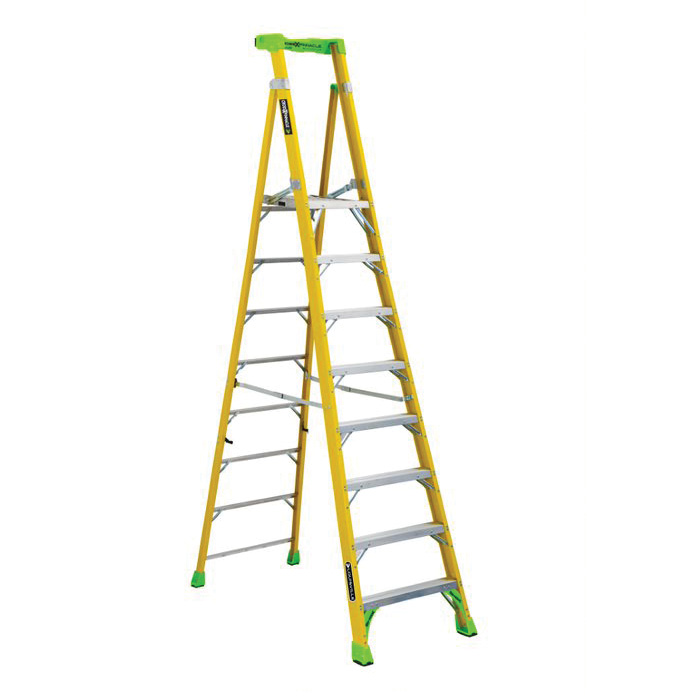 Louisville® Platform and Leaning Step Ladder, Cross Pinnacle Pro, Series: FCP1400HD, 8 ft Ladder Height, 14-1/2 in Platform Width, 21-1/4 in Platform Depth, 7 ft 7 in Platform Height, 375 lb Load, 31-5/8 in Bottom Width, 65-3/4 in Base Spread, 7 Steps, 3 in Step Depth, Non-Marring Bonded Tread, ANSI Code: A14.5 Type IAA, Fiberglass