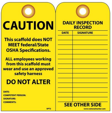 YELLOW SCAFFOLD INSPECTION TAGS 25, CAUTION THIS SCAFFOLD DOES NOT MEET FEDERAL/STATE OSHA SPECIFICATIONS. ALL EMPLOYEES WORKING FROM THIS SCAFFOLD MUST WEAR AND USE AN APPROVED SAFETY HARNESS DO NOT ALTER DATE: COMPETENT PERSON: SIGNATURE: COMMENTS