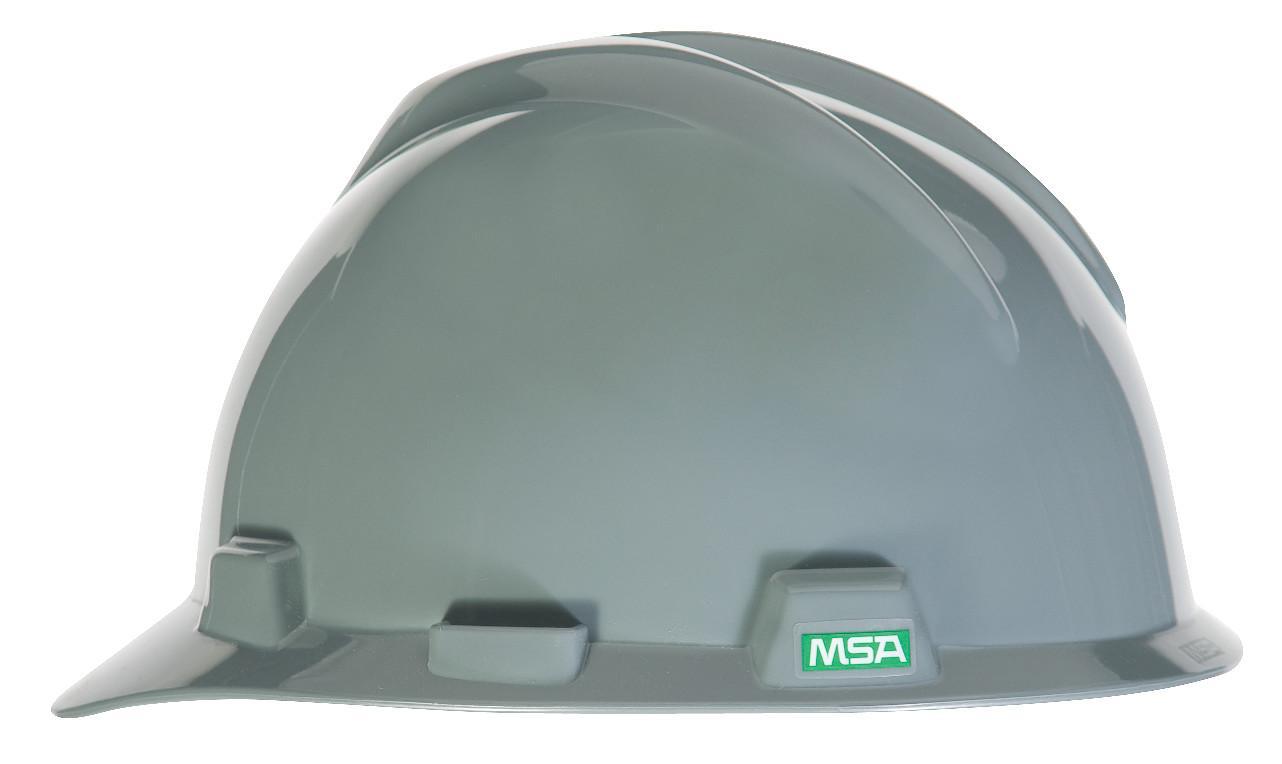 MSA V-Gard® Hard Hat, Front Brim, Standard Size, Fits Minimum Hat Size: 6-1/2, Fits Maximum Hat Size: 8, Gray, Polyethylene, 4-Point Staz-On® Suspension, ANSI Electrical Class Rating: Class E, ANSI Impact Rating: Type I, Slotted: Yes, Pin Lock Adjustment