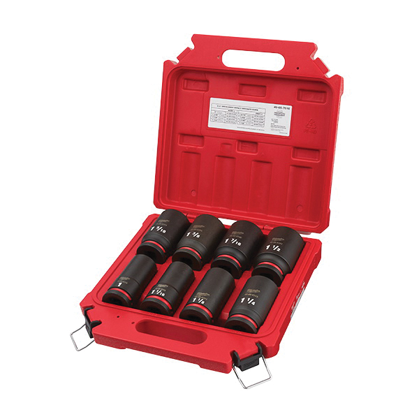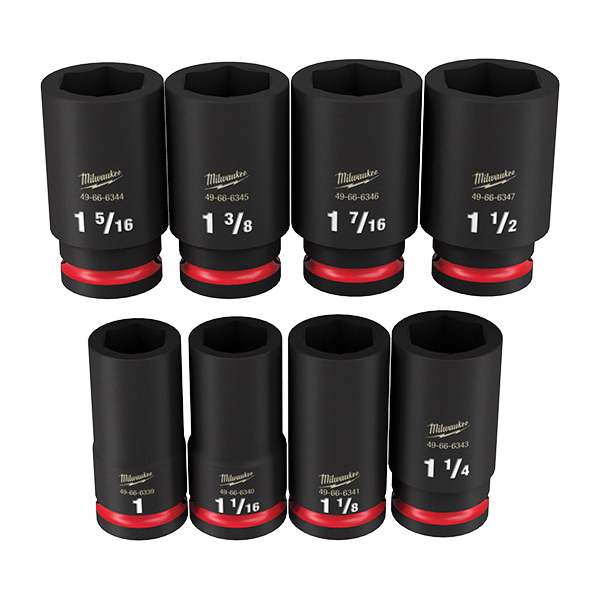 Milwaukee® SHOCKWAVE™ Impact Duty™ Socket Set, Deep, Impact Rated: Yes, Measurement System: SAE, 8 Piece, 6 Points, Included Socket Size: 1 in, 1-1/16 in, 1-1/8 in, 1-1/4 in, 1-5/16 in, 1-3/8 in, 1-7/16 in and 1-1/2 in, 3/4 in Drive, Hex Socket Shape, Case, Specifications Met: ASME Specified, For Use With: 3/4 in Drive Impact Wrenches and Adapters, Forged Steel, Black