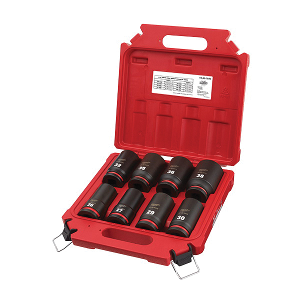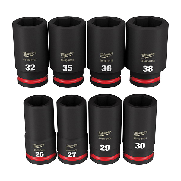 Milwaukee® SHOCKWAVE™ Impact Duty™ Socket Set, Deep, Impact Rated: Yes, Measurement System: Metric, 8 Piece, 6 Points, Included Socket Size: 26 mm, 27 mm, 29 mm, 30 mm, 32 mm, 35 mm, 36 mm and 38 mm, 3/4 in Drive, Hex Socket Shape, Case, Specifications Met: ASME Specified, For Use With: 3/4 in Drive Impact Wrenches and Adapters, Forged Steel, Black