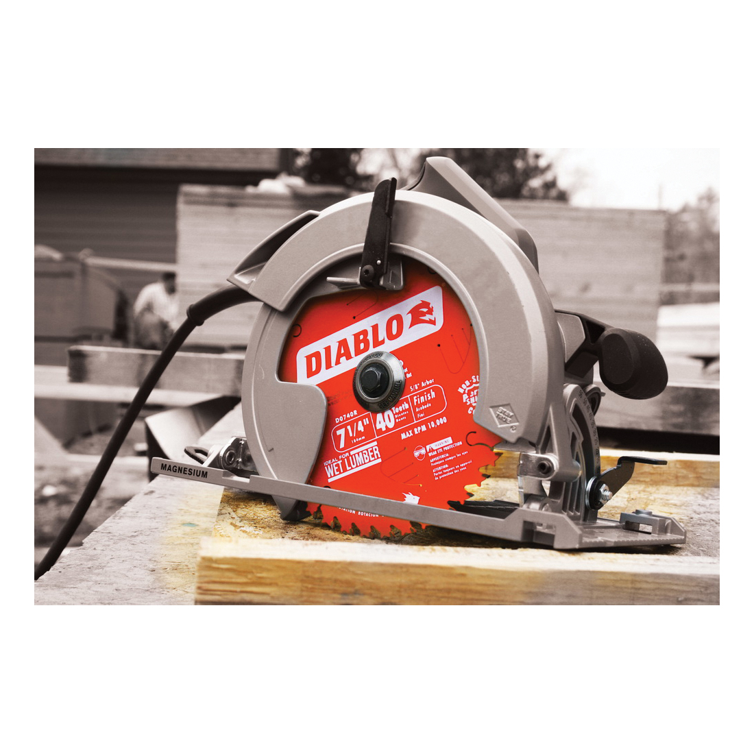 Diablo® Circular Saw Blade, Combination Diamond Knockout Laser Cut, 7-1/4 in Diameter, 0.04 in Thickness, 5/8 in Arbor, ATB Teeth, 40 Teeth, 15 deg Tooth Angle, 10000 rpm Maximum, 2-3/8 in Cutting Depth, 0.059 in Kerf, Carbide Cutting Edge, Carbide Blade, Applicable Materials: Hardwood, 2X Lumber, Laminate, Melamine, Plywood and OSB