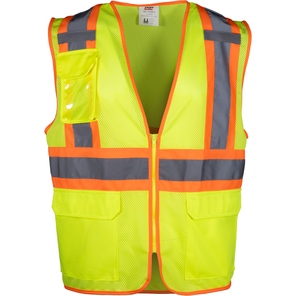 High‑visibility Class 2 mesh vest designed for construction, municipalities, shipyards, and other environments requiring enhanced visibility. Features breathable polyester mesh, two‑tone reflective tape, multiple pockets, mic tabs, and zipper front closure.