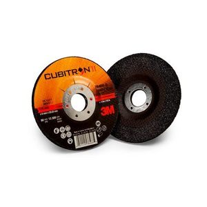 3M Cubitron II Type-Q quick change depressed center wheel uses ceramic aluminum oxide as the abrasive material and has a diameter of 4 1/2 in. In addition to the other aspects of these parts, another important component of these is the thickness. This 3M part is 1/4 in thick. All abrasive products that rotate or spin, such as the ones in this category, have a maximum speed at which you can run them. This 3M quick change depressed center wheel can be run at a maximum speed of 13,300 RPMs