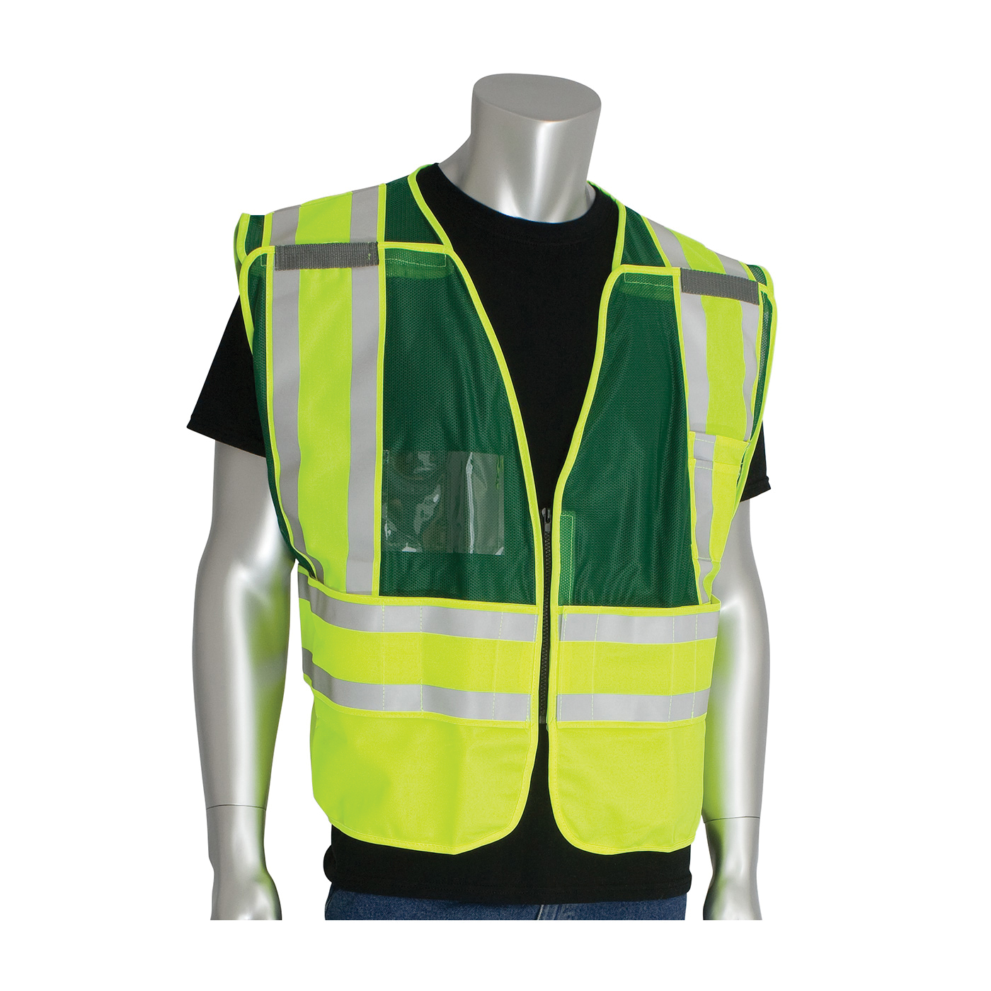 PIP® SafetyGear Public Safety Vest, Series: 302-PSV-GRN, 2XL/5XL Size, Green/Hi-Viz Lime Yellow, Polyester, 49.2 in Chest, 24.4 in Length, Front Zipper Closure, 2 Pockets, ANSI Class: Class 2, Specifications Met: ANSI/ISEA 207