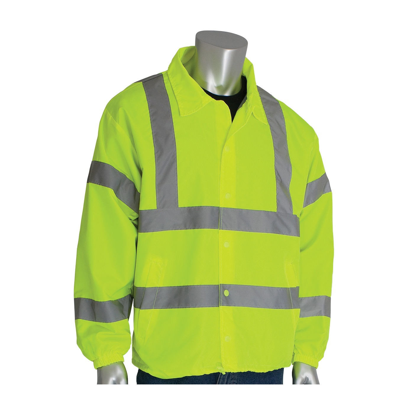 PIP® Jacket, Classic Wind Breaker, Series: 333-WB, Unisex Gender, 3XL Size, Hi-Viz Lime Yellow, Polyester, 59.8 in Chest, 29.9 in Length, Left into Right/Snap Front Closure, 2 Pockets, Specifications Met: ANSI 107 Class 3 Type R